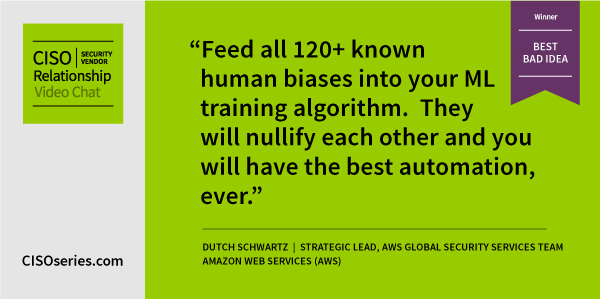 “To train your automation, after each iteration ask ‘Was this output useful?’ and you have a drinking bird toy that randomly pecks ‘Y’ or ‘N'” – Dutch Schwartz (Again!), strategic lead, AWS Global Security Services Team, AWS