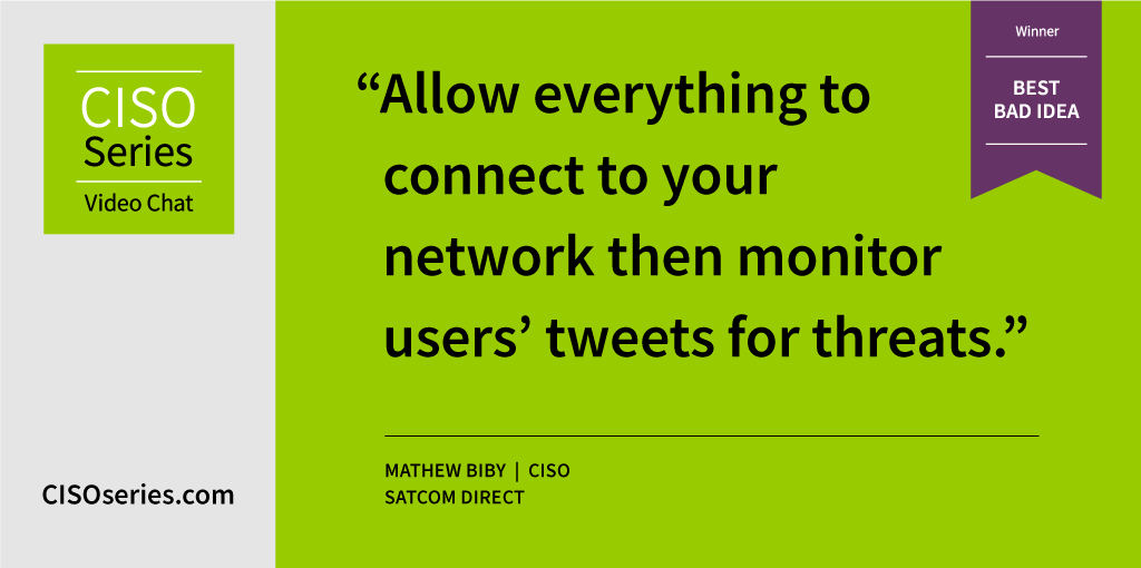 Mathew Biby, CISO, Satcom Direct took top honors for this week’s best bad idea for a suggestion that will for sure generate more Twitter traffic like, “Hey everybody, this network’s wide open, come on in!”