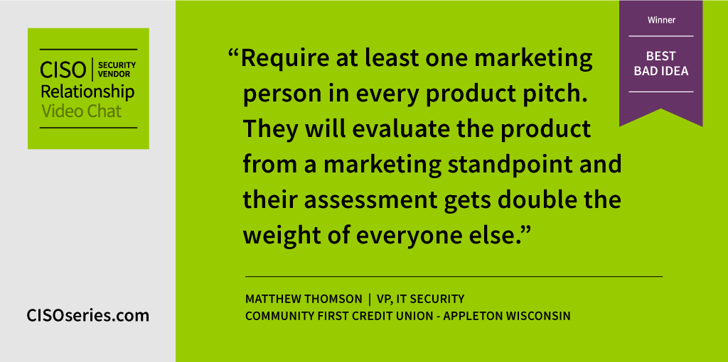 “I think as an industry we have outside influences that push us to purchase tools to ‘fix’ the problems, but really they create more care and feeding. We see so much of the marketing of what each tool can do and how it can integrate with everything else we have, however we don’t plan the projects out enough to actually use all those integrations before we’re moving onto the next product.” – Matthew Thomson, vp, IT security, Community First Credit Union – Appleton Wisconsin